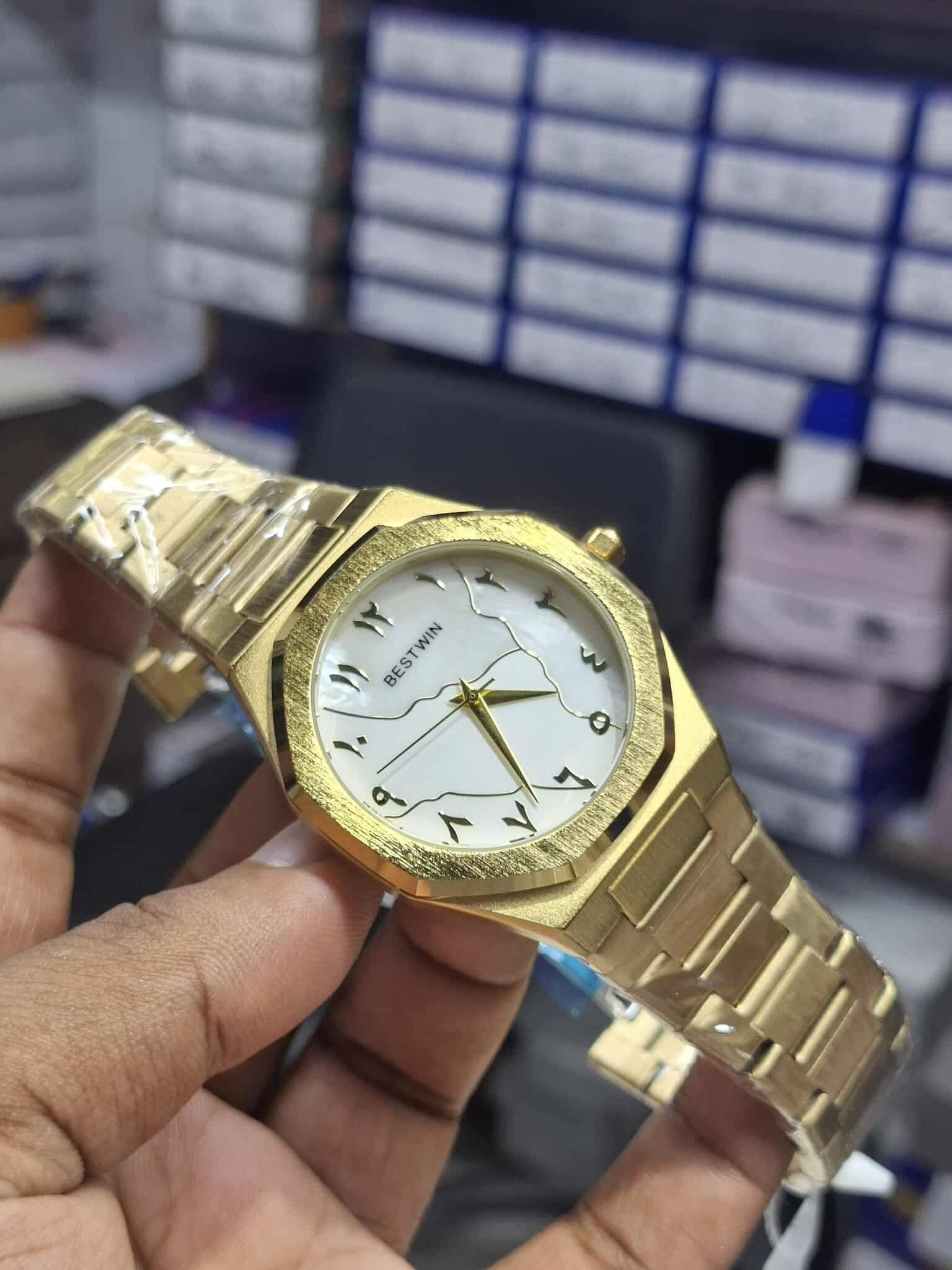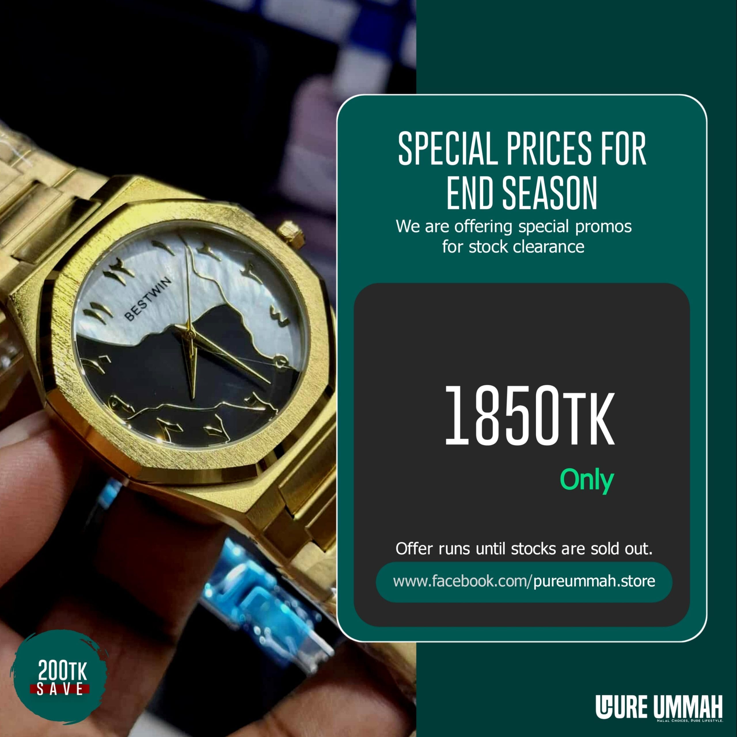 Featuring Arabic numerals on a luxurious gold finish, this timepiece is a reminder that every second is a blessing.